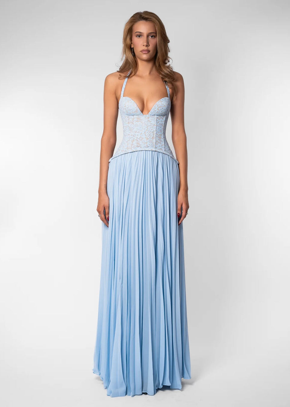 The Gaia maxi dress features a romantic, elongated silhouette with a halter neckline and plunging...